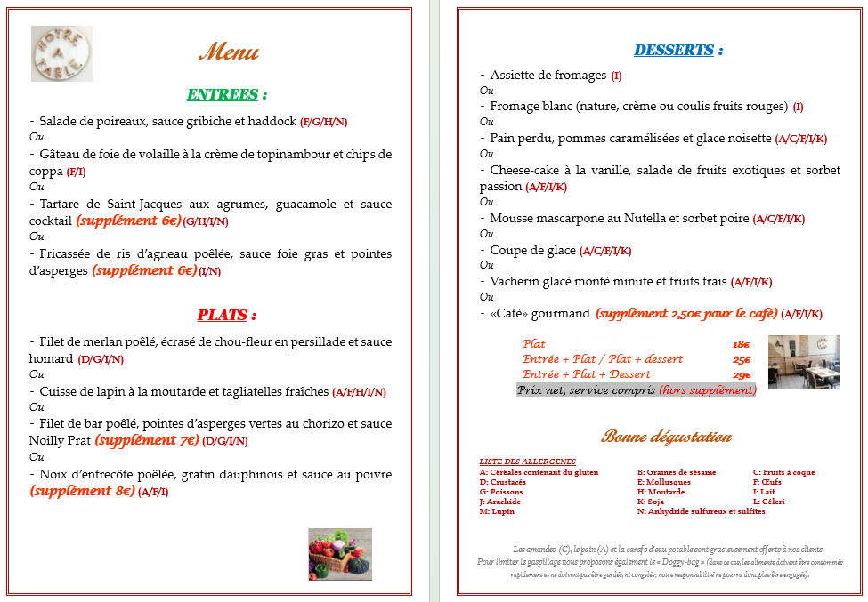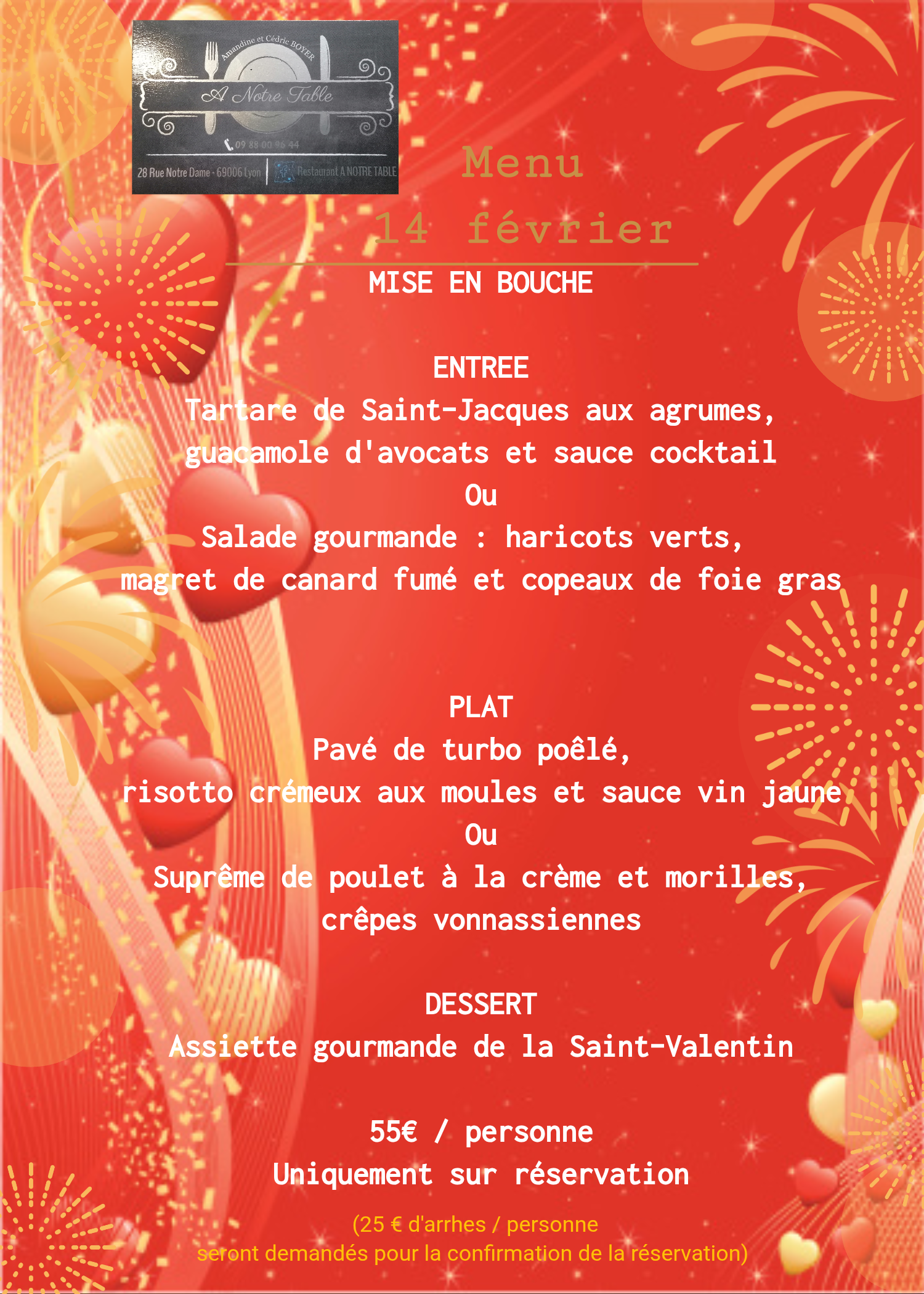 A notre Table à Lyon, c’est se garantir les plaisirs gourmands, de bons petits plats et passez un moment convivial. Après 10 ans au sein du groupe Bocuse, le chef Cédric a ouvert avec son épouse Amandine, un restaurant de cuisine traditionnelle. 4 entrées, plats ou desserts sont proposés chaque jour, autour d’une carte qui se partage entre terre et mer et qui offre des plats changeants au gré des envies et produits de saison. Vous apprécierez la cuisine du chef pour sa maitrise des cuissons, ses sauces alléchantes, ses desserts et sa parfaite sélection de produits. Amandine accorde elle parfaitement vos repas avec vins, bières et spiritueux, tous sélectionnés avec soin.
